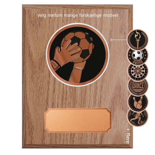 På forsiden monteres en rund og dekorativ akryldisk med motiv som passer til anledningen – for eksempel bowling, fotball, ridning m.m. Dette gjør plaketten godt egnet både for idrettslag, bedrifter og foreninger.